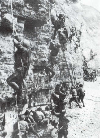 The Rangers were supposed to storm the point just as the Allied aerial and naval bombardment ceased at 0630, but due to the delay the Germans had plenty of time to recover. As the Americans disembarked and crossed the beach to the cliff, the Germans poured machine gun fire down on them. Using grappling hooks fired from the landing craft, they climbed the muddy, slippery ropes two and three at a time while the Germans rained machine gun fire and grenades down on them.